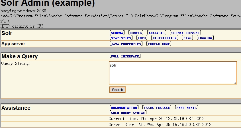 在admin界面输入solr,点击search按钮就可以看到输出结果页面