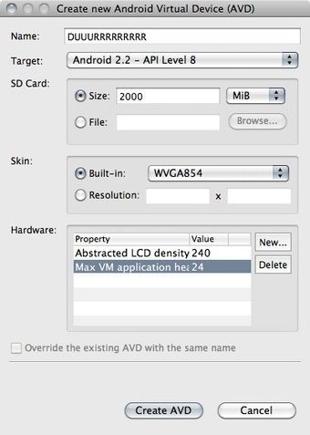 7、在这个窗口你可以设置模拟Android手机的参数。除去Android 2.2的强制目标设置,你需要设置的地方不多。你可以设置一个虚拟的SD卡,所以想设多大就设多大。而屏幕分辨率,不一定要选最高的选项(WVGA 854),它表示854像素高,如果你的电脑是MacBook或是其他的宽屏上网本,那可能超过你的电脑屏幕分辨率。