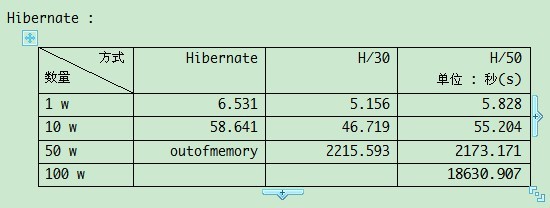 package com.dao;import java.io.Serializable;import java.sql.SQLException;import org.apache.log4j.Logger;import org.hibernate.HibernateException;import org.hibernate.Query;import org.hibernate.Session;import org.springframework.beans.factory.annotation.Autowired;import org.springframework.beans.factory.annotation.Qualifier;import org.springframework.orm.hibernate3.HibernateCallback;import org.springframework.orm.hibernate3.HibernateTemplate;import org.springframework.stereotype.Repository;/** * @author <a href="mailto:liu.anxin13@gmail.com">Tony</a> */@Repository("hibernateDAO")public class HibernateDAO<T extends Serializable> {private static final Logger log = Logger.getLogger(HibernateDAO.class);@Autowired@Qualifier("hibernateTemplate")private HibernateTemplate template;public Serializable save(T entity) {try {return template.save(entity);} catch (Exception e) {log.info("save exception : " + e.getMessage());throw new RuntimeException(e);}}public void flush() {try {template.flush();} catch (Exception e) {log.error("flush exception : " + e.getMessage());throw new RuntimeException(e);}}public int executeByHql(String hql, Object... values)throws HibernateException {try {return template.bulkUpdate(hql, values);} catch (Exception e) {log.error("executeByHql exception : " + e.getMessage());throw new HibernateException(e);}}public void clear() {try {template.clear();} catch (Exception e) {log.error("clear exception : " + e.getMessage());throw new RuntimeException(e);}}public void execute(final String sql, final Object... values) {template.execute(new HibernateCallback() {public Object doInHibernate(Session session) throws HibernateException,SQLException {Query query = session.createSQLQuery(sql);int i = 0;for (Object obj : values) {query.setParameter(i++, obj);}return query.executeUpdate();}});}}package com.service;import java.util.Date;import org.apache.log4j.Logger;import org.springframework.beans.factory.annotation.Autowired;import org.springframework.beans.factory.annotation.Qualifier;import org.springframework.stereotype.Service;import com.dao.HibernateDAO;import com.model.UserInfo;import com.util.Global;import com.util.StringUtils;/** * @author <a href="mailto:liu.anxin13@gmail.com">Tony</a> */@Service("hibernateService")public class HibernateService {private static final Logger log = Logger.getLogger(HibernateService.class);@Autowired@Qualifier("hibernateDAO")private HibernateDAO<UserInfo> dao;public void testOcean(long num) {UserInfo user = null;log.info("start test Hibernate...");long begin = System.currentTimeMillis();for (int i = 1; i < (num + 1); i++) {user = new UserInfo();dao.save(user);user = null;if (Global.IS_BATCH) {if (i % Global.BATCH_NUMBER == 0) {dao.flush();dao.clear();}}if (i % 20000 == 0)System.out.printf("%s [%8d] number with a count...\n", StringUtils.getStringFromDate(new Date(), ""), i);}long end = System.currentTimeMillis();log.info("insert " + num + " count, consume " + (end - begin) / 1000.00000000 + " seconds");}public int count() {long begin = System.currentTimeMillis();int rt = dao.executeByHql("SELECT COUNT(ID) FROM UserInfo");long end = System.currentTimeMillis();log.info("query count, consume [" + (end - begin) / 1000.00000000 + "] seconds");return rt;}public void truncate() {long begin = System.currentTimeMillis();// 执行 native SQLdao.execute("TRUNCATE T_USERINFO");long end = System.currentTimeMillis();log.info("truncate table, consume [" + (end - begin) / 1000.00000000 + "] seconds");}}package com.test;import org.apache.log4j.Logger;import org.junit.Test;import org.junit.runner.RunWith;import org.springframework.beans.factory.annotation.Autowired;import org.springframework.beans.factory.annotation.Qualifier;import org.springframework.test.context.ContextConfiguration;import org.springframework.test.context.junit4.SpringJUnit4ClassRunner;import com.service.HibernateService;import com.util.Global;/** * @author <a href="mailto:liu.anxin13@gmail.com">Tony</a> */@RunWith(SpringJUnit4ClassRunner.class)@ContextConfiguration(locations = { "classpath:applicationContext.xml" })public class TestHibernate {private static final Logger log = Logger.getLogger(TestHibernate.class);@Autowired@Qualifier("hibernateService")private HibernateService hibernate;@Testpublic void testHibernate() {hibernate.testOcean(Global.NUM);System.err.printf("see momory! have a quick please...\n");try {Thread.sleep(10000);} catch (Exception e) {log.error("exception: " + e.getMessage());}}// @Testpublic void testCount() {log.info("count: " + hibernate.count());}// @Testpublic void truncate() {hibernate.truncate();}}package com.dao;import java.io.IOException;import java.sql.Connection;import java.sql.DriverManager;import java.util.Properties;import org.apache.log4j.Logger;import org.springframework.beans.factory.annotation.Autowired;import org.springframework.beans.factory.annotation.Qualifier;import org.springframework.jdbc.core.JdbcTemplate;import org.springframework.stereotype.Repository;/** * @author <a href="mailto:liu.anxin13@gmail.com">Tony</a> */@Repository("jdbcDAO")public class JdbcDAO {private static final Logger log = Logger.getLogger(JdbcDAO.class);@Autowired@Qualifier("jdbcTemplate")private JdbcTemplate template;public Connection getConn() {try {return template.getDataSource().getConnection();} catch (Exception e) {log.info("获取连接时异常: " + e.getMessage());throw new RuntimeException(e);}}// 如果感觉使用 spring 获取的 Connection 太慢, 直接使用下面的直连...private static Properties p = new Properties();static {try {p.load(JdbcDAO.class.getClassLoader().getResourceAsStream("jdbc.properties"));} catch (IOException e) {}}public Connection getConnection() {try {String driver = p.getProperty("jdbc.driver");String url = p.getProperty("jdbc.url");String user = p.getProperty("jdbc.username");String password = p.getProperty("jdbc.password");Class.forName(driver);return DriverManager.getConnection(url, user, password);} catch (Exception e) {log.error("connect