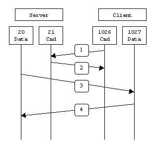 第三步:FTP服务器发起一个从它自己的数据端口20向客户端先前指定的数据端口20的连接;