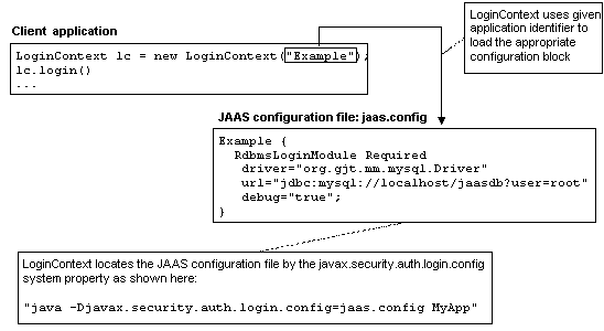 在应用程序层中,你可以使用LoginContext对象来验证Subject对象。LoginContext对象同时体现了JAAS的动态可插入性(Dynamic Pluggability),因为当你创建一个LoginContext的实例时,你需要指定一个配置。LoginContext通常从一个文本文件中加载配置信息,这些配置信息告诉LoginContext对象在登录时使用哪一个LoginModule对象。