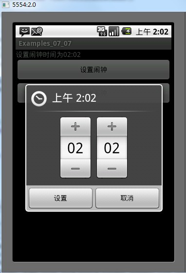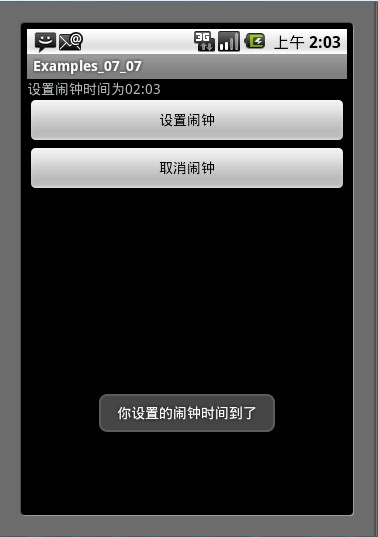 要实现闹钟,首先需要创建一个继承自 BroadcastReceiver 的类,实现 onReceive 方法来接收这个Alarm服务,然后通过建立Intent 和 PendingIntent连接来调用 Alarm组件。当我们点击“设置闹钟”按钮时,通过 TimePickerDialog 来设置时间,当时间到我们指定的时间后onReceive 方法接收Alarm服务 运行效果见下图