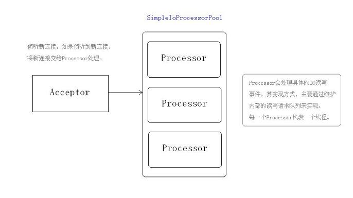 IoProcessor得任务则是处理这些连接的IO事件。显然IoProcessor不可能和IoAcceptor在同一个线程里运行。他们两个分工不同,可以并发执行。Mina内部事实上维护了一个IoProcessor对象池,对象池的默认大小是CPU个数+1.也就是说,如果你的机器是4核的,可能就有5个IoProcessor(可以理解为线程)同时工作。