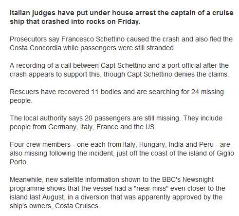 pauselWlian judges have put under house arrest the wpWin of a cruiseship that crashed into rocks on Friday.Pr0%ut0rs say Francesc0 Scheffin0 cau%d the crash and als0 l% theC0sta C0nc0rdia while pas%ngers were still strand%.A rec0rding 0l a call De een Capt Scheffin0 and a p0rt 0ncial affer thecrash appears t0 supp0rt this. th0ugh Capt Scheffin0 denies the claims.Rescuers have r%0vered 1 1 Dodies and are searching l0r 24 missingpe0ple,The Imal auth0rity says 20 passengers are still missing. They includepe0ple lr0m Germany. Italy. France and the US.F0ur crew memDers 0ne each lr0m Italy, Hungay. India and Peru areals0 missing l0II0wing the incident. just 0ff the c0ast 0l the island 0l Gigli0P0rt0.Meanwhile. new satellite inl0rmati0n sh0wn t0 the BBC's Newsnightpr0gramme sh0ws that the vessel had a ''near miss'' even cl0ser t0 theisland last August. in a diversi0n that was apparentl? appr0v% Dy theship's 0wners. C0sta Crui%s.