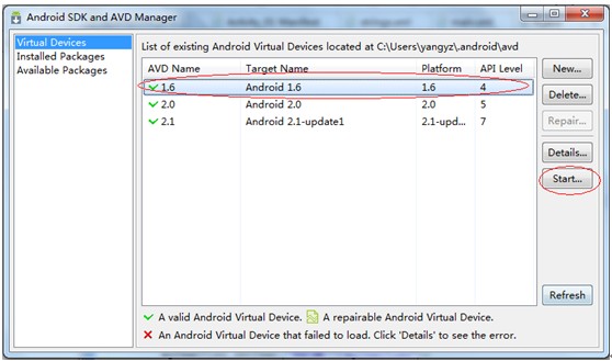 4)、选择已配置好的模拟器,点击Start进行启动。
