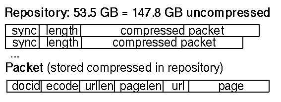 数据仓库包括了每个web页面的整个HTML代码。每个页面用zlib(参见RFC1950)压缩。压缩技术的选择是速度和压缩比的一个权衡。我们选择zlib是因为它的压缩速度要比bzip快很多。在数据仓库上,bzip的压缩比是4:1,而zlib的是3:1。在数据仓库中,文档一个一个连接存放,每个文档有一个前缀,包括docID,长度和URL(如图2)。要访问这些文档,数据仓库不再需要其他的数据结构。这使得保持数据一致性和开发都更简单;我们可以仅仅通过数据仓库和一个记录爬虫错误信息的文件来重建其他所有的数据结构。