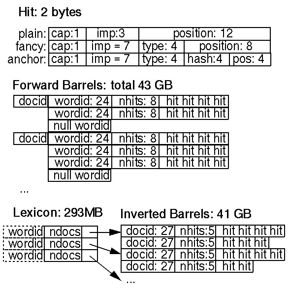 一个命中列表对应着一个单词在一个文档中出现的位置、字体和大小写信息的列表。命中列表占用了正排索引和倒排索引的大部分空间,所以怎样尽可能有效的表示是很重要的。我们考虑了对位置,字体和大小写信息的多种编码方式——简单编码(3个整数),压缩编码(手工优化分配比特)和霍夫曼编码(Huffman coding)。命中(hit)的详情见图3。