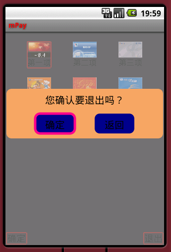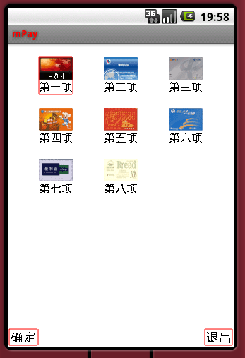 public mPayCanvas(Context context) {super(context); //获得屏幕宽高 WindowManager windowManager = getWindowManager(); Display display = windowManager.getDefaultDisplay(); width = display.getWidth(); height = display.getHeight(); Log.i("TAG", "screenWidth="+width);//320 Log.i("TAG", "screenHeight="+height);//480width=320;height=430;// TODO Auto-generated constructor stubtext=new String[10];paint=new Paint[10];rect=new RectF[10];col=3;//菜单列数state=ST_Instruction;setST(state);setFocusable(true); // 如果要响应按键,必须加上这句clearFocus();//必须加,以防第一次按键时无效。//setClickable(true);setFocusableInTouchMode(true);//setPressed(true);setLongClickable(false);setTitleColor(0xffff0000);}private void draw_Menu(Canvas canvas){//canvas.drawText("菜单", (getWidth()-(int)paint[0].measureText(text[0]))>>1, getHeight()>>1, paint[0]);for(int i=0;i<drawable.length;i++){drawable[i].draw(canvas);canvas.drawText(menu_item[i], drawable[i].getBounds().left, drawable[i].getBounds().bottom+paint[2].getTextSize(), paint[2]);}RectF rect_menu = new RectF(drawable[index].getBounds().left, drawable[index].getBounds().top, drawable[index].getBounds().right, drawable[index].getBounds().bottom+paint[2].getTextSize()+5);canvas.drawRect(rect_menu, paint[3]);drawButton(canvas,true,true); } private void touchEvent_Menu(MotionEvent event){ float x=event.getX();float y=event.getY();if(x>rect[0].left&&x<rect[0].right&&y>rect[0].top&&y<rect[0].bottom){switch (index) {case 0:setST(ST_InputNumber);break;case 1:case 2:case 3:Log.i("TAG", "index====="+index);break;default:break;}return;}else if(x>rect[1].left&&x<rect[1].right&&y>rect[1].top&&y<rect[1].bottom){setST(ST_Exit);return;}int xx=drawable[0].getBounds().left;int yy=drawable[0].getBounds().top;int w=drawable[0].getIntrinsicWidth();//32int h=drawable[0].getIntrinsicHeight()+(int)paint[2].getTextSize();//48+int gapX=xx;int gapY=this.gapY-(int)paint[2].getTextSize();//Log.i("TAG", "w=="+w);// Log.i("TAG", "h=="+h);// Log.i("gapX", "gapX=="+gapX);// Log.i("gapY", "gapY=="+gapY); int indexX=0;int indexY=0;for(int i=0;i<drawable.length;i++){indexX=i%col; indexY=i/col; if (x >= xx+indexX*gapX + indexX * w && x < xx+indexX*gapX + (indexX + 1) * w && y >= yy+indexY*gapY + indexY * h && y < yy+indexY*gapY + (indexY + 1) * h) { this.index=i; this.indexX=indexX; this.indexY=indexY;// Log.i("TAG", "index=="+index);// Log.i("TAG", "indexX=="+indexX);// Log.i("TAG", "indexY=="+indexY);// Log.i("TAG", "=============================================="); keyDown_Menu(KeyEvent.KEYCODE_DPAD_CENTER,null); break; }} }private void drawButton(Canvas canvas,boolean hasLeft,boolean hasRight){ if(hasLeft){ canvas.drawText(text[8], rect[0].left+2, rect[0].bottom-5, paint[0]);// canvas.drawText(text[8], x+5, height-5, paint[0]);// rect[0] = new RectF(2, getHeight()-paint[0].getTextSize()-2-5, 2+paint[0].measureText(text[8])+5, getHeight()-2); canvas.drawRect(rect[0], paint[3]); } if(hasRight){ canvas.drawText(text[9], rect[1].left+2, rect[1].bottom-5, paint[0]);// canvas.drawText(text[9], width-paint[0].measureText(text[9])-2, height-5, paint[0]);// rect[1] = new RectF(getWidth()-paint[0].measureText(text[9])-5, getHeight()-paint[0].getTextSize()-2-5, getWidth()-2, getHeight()-2); canvas.drawRect(rect[1], paint[3]); } } private void drawGrid(Canvas canvas){ String[][] pad={{"1","2","3"},{"4","5","6"},{"7","8","9"},{"退格","0","全清"}}; RectF rect=null; int col=pad[0].length; int row=pad.length; int w=80; int h=60; int x=((width-col*w)>>1); int y=(height>>1)-h*2; for(int i=0;i<row;i++){ for(int j=0;j<col;j++){ rect = new RectF(x+j*w,y+i*h,x+j*w+w,y+h+i*h); canvas.drawRect(rect, paint[3]); canvas.drawText(pad[i][j], rect.left+((int)(w-paint[0].measureText(pad[i][j]))>>1),rect.top+(h>>1)+5, paint[0]); } } }