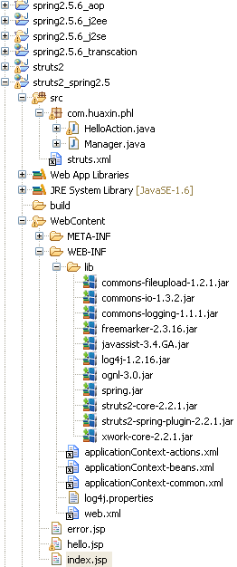 struts-2.2.1与spring2.5.6的整合 使用方法和配置与2.1.8.1完全相同,详细内容看本人博客"struts-2.1.8.1与spring2.5.6的整合"http://phl.iteye.com/blog/739019,就是包的版本不同,并且多了一个包javassist-3.4.GA.jar其他完全一样希望朋友们使用愉快下面是2.2.1的项目结构