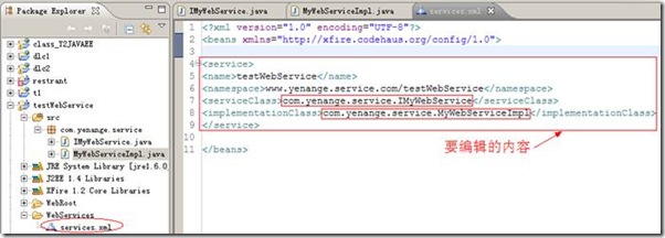 package com.yenange.service;import java.net.MalformedURLException;import org.codehaus.xfire.XFireFactory;import org.codehaus.xfire.client.XFireProxyFactory;import org.codehaus.xfire.service.Service;import org.codehaus.xfire.service.binding.ObjectServiceFactory;public class TestWS {public static void main(String[] args) {//1.取得WebService的路径String url="http://localhost:8080/testWebService/services/testWebService";//2.创建服务Service service=new ObjectServiceFactory().create(IMyWebService.class);//3.创建服务代理XFireProxyFactory factory=new XFireProxyFactory(XFireFactory.newInstance().getXFire());//4.调用外部的WebService, 建立对象. 再测试其方法try {IMyWebService obj=(IMyWebService)factory.create(service,url);System.out.println(obj.HelloWorld("leaf"));} catch (MalformedURLException e) {e.printStackTrace();}}}