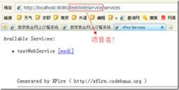5. 部署后在浏览器中测试: http://localhost:8080/testWebService/services, 格式是固定的,中间换成项目名即可!