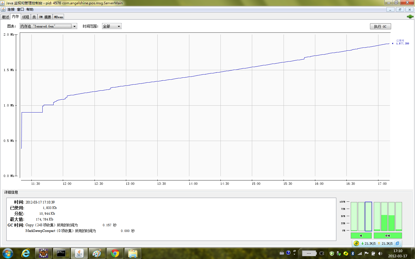 OLD养老区的内存一直呈现上升趋势,而且在这5个多小时里面,一直没有下降的趋势。这个是为什么呢?大家知道, 内存溢出通常发生于OLD段或Perm段垃圾回收后,仍然无内存空间容纳新的Java对象的情况。那么这个现象会不会出现内存溢出呢?我们在前面了解到,OLD养老区的内存回收mark-compact,一般是比较慢的,所以这5个小时,没有发生过一次养老区的垃圾回收。当OLD去的空间不够时,JVM会在OLD区进行完全的垃圾收集(0级),这样就会避免出现OLD区的OOM错误。