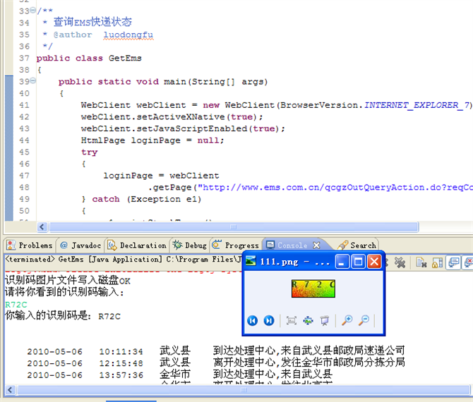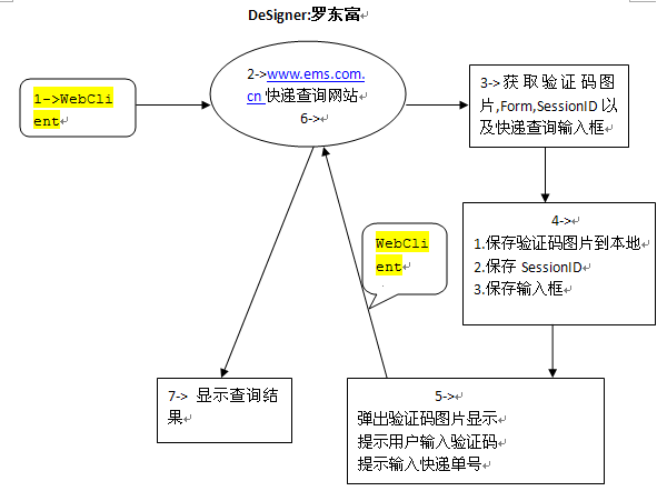 现在都是流行网上购物了,大家一定关心自己购买东西快递现在已经发到什么地方了,现在想查一查。当然现在有很多提供这种服务,我今天就给大家实现一个无需打开浏览器就可以实现EMS快递查询,简单讲述其原理。以下是我简单画的流程图(随便用office画,很山賽,哈哈):好了,我们开始源码吧: