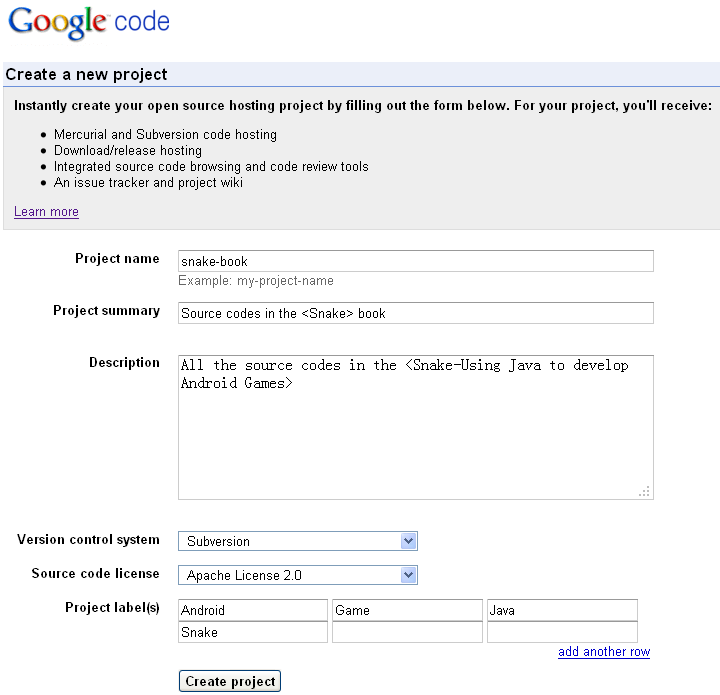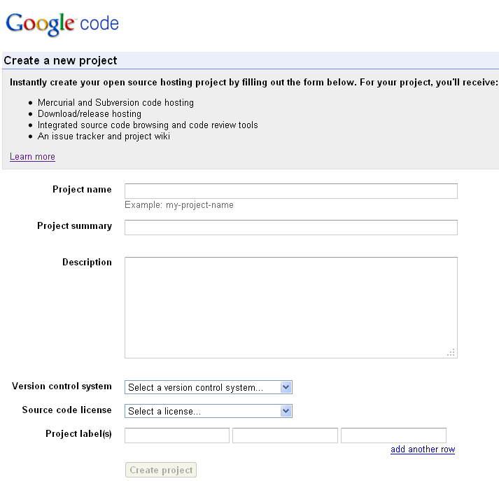 1. 访问http://code.google.com/hosting/