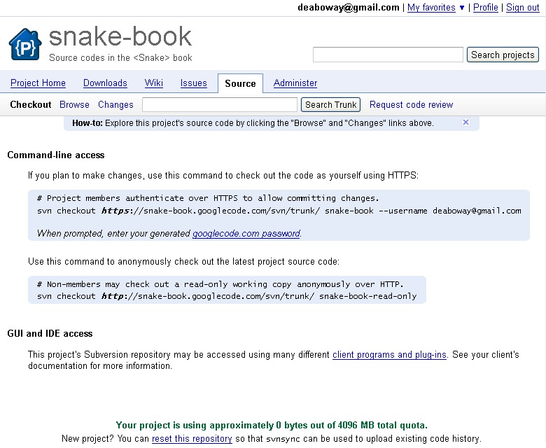 1. 现在就可以直接通过http://code.google.com/p/snake-book/ 访问刚刚创建的项目了,点击source可以看到如下图所示。待会咱们就可以使用Eclipse提交文件到https ://snake-book.googlecode.com/svn/trunk/ 地址,并通过帐户密码进行update,需要注意的是,以后管理该项目的密码就是这里“googlecode.com password”帮我们生成的比较复杂安全性比较高的密码。另外一个地址:http ://snake-book.googlecode.com/svn/trunk/ 给匿名用户checkout代码出来使用,只读权限。