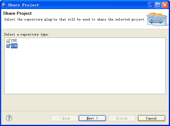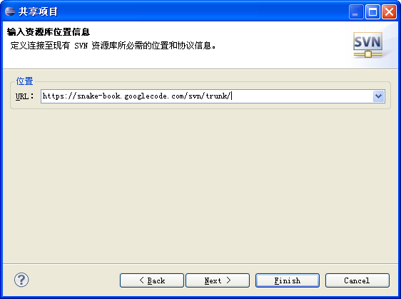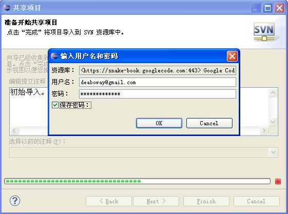 3. 现在我们就可以把源代码提交到svn服务器上,打开要上传的项目,右键->team->share Project->svn,写入https路径。下一步,输入Google账号和上传密码,起个名,finish。如下图: