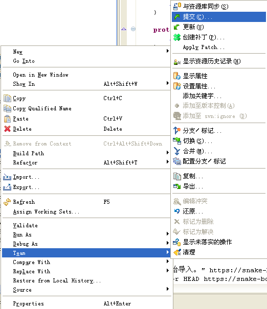 2. 在我们进行了代码或者文件的更新之后,就可以通过:右键->team->commit来进行代码的提交,如下图:
