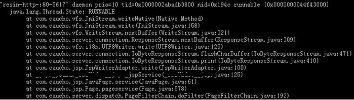 某个OpenAPI应用在大并发量情况下,其中某个jsp总会堵在一个for循环的JspWriter.write处,通过jstack观察如下: