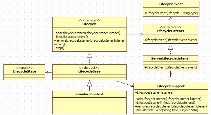 Lifecycle定义了组件生命周期中的通用事件(START_EVENT、STOP_EVENT等)和接口(start、stop、destroy、addLifecycleListener、removeLifecycleListener等)。组件可以通过实现Lifecyecle接口,完成组建的重要生命周期实现和组建的观察者管理。