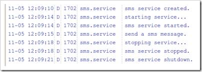 这是操作:启动、停止和退出应用,显示的调试日志信息。模拟后台服务每5秒钟发送一次短信信息。