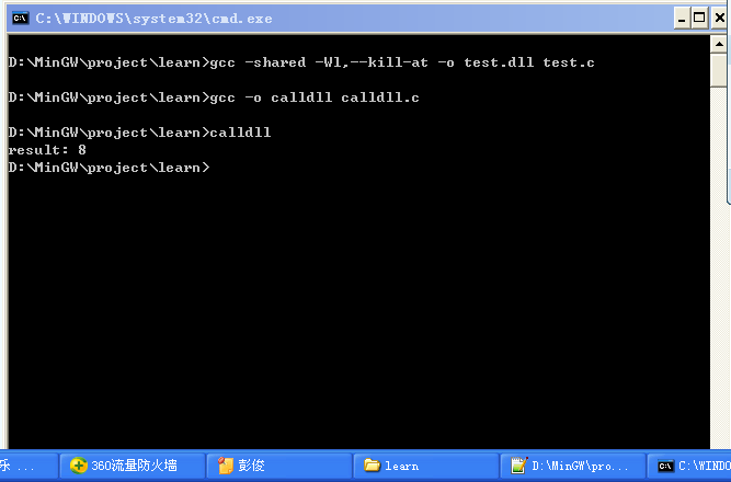 int add(int x,int y){return x+y;}#include <windows.h>#include <stdio.h>#include <winbase.h>typedef int (*MYPROC)(int ,int);void main(){int res = 0;HINSTANCE LibHandle;MYPROC ProcAdd;LibHandle = LoadLibrary("test.dll"); /*载入dll*/ProcAdd = (MYPROC)GetProcAddress(LibHandle, "add"); /*获取函数sysbuf的地址*/res =(ProcAdd) (4,4); /*ProcAdd就相当于函数 show123*/printf("result: %i ",res);}