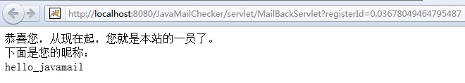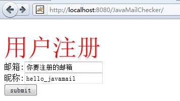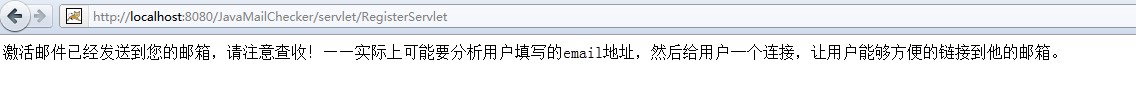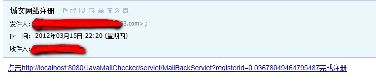 <%@ page language="java" import="java.util.*" pageEncoding="UTF-8"%><!DOCTYPE HTML PUBLIC "-//W3C//DTD HTML 4.01 Transitional//EN"><html> <head> <title>用户注册利用邮箱进行验证</title> </head> <body> <br/><form action="${pageContext.request.contextPath }/servlet/RegisterServlet" method="post"><font size="24" color="red">用户注册</font><br/>邮箱:<input type="text" name="email" /><br/>昵称:<input type="text" name="userName" /><br/><input type="submit" value="submit" /><br/></form> </body></html>package com.piedra.register;import java.io.IOException;import java.util.Date;import java.util.Properties;import javax.mail.Address;import javax.mail.Authenticator;import javax.mail.Message.RecipientType;import javax.mail.MessagingException;import javax.mail.Transport;import javax.mail.internet.InternetAddress;import javax.mail.internet.MimeMessage;import javax.servlet.ServletException;import javax.servlet.http.HttpServlet;import javax.servlet.http.HttpServletRequest;import javax.servlet.http.HttpServletResponse;import javax.servlet.http.HttpSession;import com.piedra.model.MyAuthenticator;public class RegisterServlet extends HttpServlet {private static final long serialVersionUID = 1L;public void doGet(HttpServletRequest request, HttpServletResponse response)throws ServletException, IOException {String toMail = request.getParameter("email");String registerName = request.getParameter("userName");String userName = "你邮箱地址";String password = "你邮箱密码";String registerId = "" + Math.random() * Math.random();String url = "http://localhost:8080/JavaMailChecker/servlet/MailBackServlet?registerId=" + registerId;//待会用户点在邮箱中点击这个链接回到你的网站。HttpSession httpSession = request.getSession();httpSession.setAttribute(registerId, registerName);httpSession.setMaxInactiveInterval(600);Properties props = new Properties();props.setProperty("mail.smtp.host", "smtp.163.com");props.setProperty("mail.smtp.auth", "true");Authenticator authenticator = new MyAuthenticator(userName, password);javax.mail.Session session = javax.mail.Session.getDefaultInstance(props,authenticator);session.setDebug(true);try{Address from = new InternetAddress(userName);Address to = new InternetAddress(toMail);MimeMessage msg = new MimeMessage(session);msg.setFrom(from);msg.setSubject("诚实网站注册");msg.setSentDate(new Date());msg.setContent("<a href='" + url + "'>点击" + url + "完成注册</a>", "text/html;charset=utf-8");msg.setRecipient(RecipientType.TO, to);/*Transport transport = session.getTransport("smtp");transport.connect("smtp.163.com", userName, password);transport.sendMessage(msg,msg.getAllRecipients());transport.close();*/Transport.send(msg);} catch(MessagingException e){e.printStackTrace();}request.getRequestDispatcher("/sendMailSuccess.jsp").forward(request, response);}public void doPost(HttpServletRequest request, HttpServletResponse response)throws ServletException, IOException {doGet(request, response);}}package com.piedra.model;import javax.mail.Authenticator;import javax.mail.PasswordAuthentication;public class MyAuthenticator extends Authenticator {private String userName;private String password;public MyAuthenticator(String userName, String password){this.userName = userName;this.password = password;}@Overrideprotected PasswordAuthentication getPasswordAuthentication() {return new PasswordAuthentication(userName, password);}}package com.piedra.register;import java.io.IOException;import javax.servlet.ServletException;import javax.servlet.http.HttpServlet;import javax.servlet.http.HttpServletRequest;import javax.servlet.http.HttpServletResponse;public class MailBackServlet extends HttpServlet {private static final long serialVersionUID = 1L;public void doGet(HttpServletRequest request, HttpServletResponse response)throws ServletException, IOException {String registerID = request.getParameter("registerId");if(registerID == null){request.getRequestDispatcher("/index.jsp").forward(request,response);return ;}String registerName = (String)request.getSession().getAttribute(registerID);if(registerName == null || registerName.equals("")){request.getRequestDispatcher("/index.jsp").forward(request,response);return ;}request.setAttribute("registerName", registerName);request.getRequestDispatcher("/registSuccess.jsp").forward(request,response);}public void doPost(HttpServletRequest request, HttpServletResponse response)throws ServletException, IOException {doGet(request, response);}}<%@ page language="java" import="java.util.*" pageEncoding="UTF-8"%><!DOCTYPE HTML PUBLIC "-//W3C//DTD HTML 4.01 Transitional//EN"><html> <head> <title>注册成功</title> </head> <body> 恭喜您,从现在起,您就是本站的一员了。<br/> 下面是您的昵称:<br/> ${registerName } </body></html>