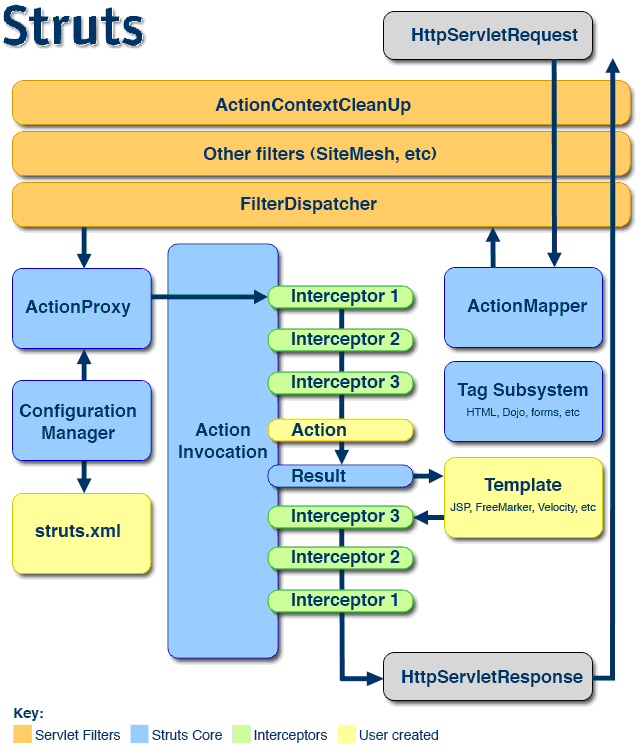 从图可以看出,一个请求在Struts2框架中的处理大概分为以下几个步骤: