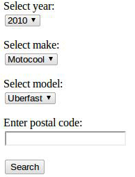 首先,用户选择摩托车的年份。然后,用户选择摩托车的构造。最后用户选择摩托车的型号。从始至终,Ajax一直在后台运行,更新Web应用程序中的下拉框来为用户过滤清单,以方便用户选择。