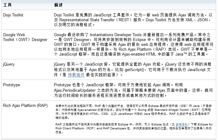 很多现有的优秀工具,除了能提供Ajax调用之外,还能支持很多其他函数与特性,比如动画。表1中列出了其中一些工具。