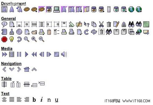 Microsoft 做得比较好的一点是确保 Windows 应用程序有一个一致的外观和效果。如果您在很久之前就已经在编写 Java Swing 应用程序了,您可能会遇到 Oracle 的 Java Look-and-Feel Graphics Repository。如果没有,那您是比较幸运的。Java Look-and-Feel Graphics Repository 含有一个系列标准应用程序行为图标,比如 File->New 和 Edit->Copy,以及比较深奥的命令,比如媒体控制、浏览器导航功能、Java 开发人员的编程图标。图 5 展示了一个从 Oracle 网站抓取的图标: