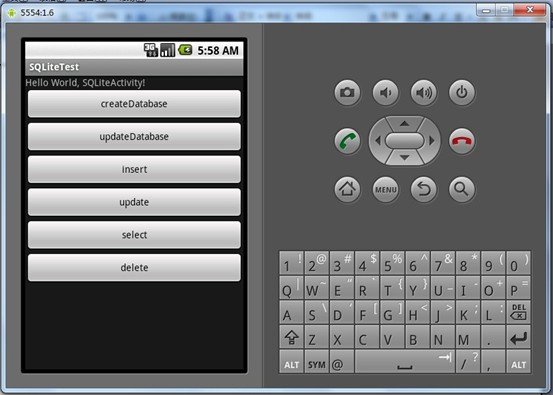 package android.sqlite;import android.content.Context;import android.database.sqlite.SQLiteDatabase;import android.database.sqlite.SQLiteOpenHelper;import android.database.sqlite.SQLiteDatabase.CursorFactory;/** * SQLiteOpenHelper是一个辅助类,用来管理数据库的创建和版本他,它提供两个方面的功能 * 第一,getReadableDatabase()、getWritableDatabase()可以获得SQLiteDatabase对象,通过该对象可以对数据库进行操作 * 第二,提供了onCreate()、onUpgrade()两个回调函数,允许我们再创建和升级数据库时,进行自己的操作 */public class DatabaseHelper extends SQLiteOpenHelper {private static final int VERSION = 1;/** * 在SQLiteOpenHelper的子类当中,必须有该构造函数 * @param context上下文对象 * @param name数据库名称 * @param factory * @param version当前数据库的版本,值必须是整数并且是递增的状态 */public DatabaseHelper(Context context, String name, CursorFactory factory,int version) {//必须通过super调用父类当中的构造函数super(context, name, factory, version);}public DatabaseHelper(Context context, String name, int version){this(context,name,null,version);}public DatabaseHelper(Context context, String name){this(context,name,VERSION);}//该函数是在第一次创建的时候执行,实际上是第一次得到SQLiteDatabase对象的时候才会调用这个方法@Overridepublic void onCreate(SQLiteDatabase db) {// TODO Auto-generated method stubSystem.out.println("create a database");//execSQL用于执行SQL语句db.execSQL("create table user(id int,name varchar(20))");}@Overridepublic void onUpgrade(SQLiteDatabase arg0, int arg1, int arg2) {// TODO Auto-generated method stubSystem.out.println("upgrade a database");}}package android.sqlite;import android.app.Activity;import android.content.ContentValues;import android.database.Cursor;import android.database.sqlite.SQLiteDatabase;import android.os.Bundle;import android.view.View;import android.view.View.OnClickListener;import android.widget.Button;public class SQLiteActivity extends Activity {/** Called when the activity is first created. */private Button createDatabaseButton = null;private Button updateDatabaseButton = null;private Button insertButton = null;private Button updateButton = null;private Button selectButton = null;private Button deleteButton = null;@Overridepublic void onCreate(Bundle savedInstanceState) {super.onCreate(savedInstanceState);setContentView(R.layout.main);// 根据控件id获得相应的控件对象createDatabaseButton = (Button) findViewById(R.id.createDatabase);updateDatabaseButton = (Button) findViewById(R.id.updateDatabase);insertButton = (Button) findViewById(R.id.insert);updateButton = (Button) findViewById(R.id.update);selectButton = (Button) findViewById(R.id.select);deleteButton = (Button) findViewById(R.id.delete);// 为按钮设置监听器createDatabaseButton.setOnClickListener(new CreateDatabaseOnClickListener());updateDatabaseButton.setOnClickListener(new UpdateDatabaseOnClickListener());insertButton.setOnClickListener(new InsertOnClickListener());updateButton.setOnClickListener(new UpdateOnClickListener());selectButton.setOnClickListener(new SelectOnClickListener());deleteButton.setOnClickListener(new DeleteOnClickListener());}// createDatabaseButton点击事件监听器class CreateDatabaseOnClickListener implements OnClickListener {public void onClick(View v) {// 创建了一个DatabaseHelper对象,只执行这句话是不会创建或打开连接的DatabaseHelper dbHelper = new DatabaseHelper(SQLiteActivity.this,"test_yangyz_db");// 只有调用了DatabaseHelper的getWritableDatabase()方法或者getReadableDatabase()方法之后,才会创建或打开一个连接SQLiteDatabase sqliteDatabase = dbHelper.getReadableDatabase();}}// updateDatabaseButton点击事件监听器class UpdateDatabaseOnClickListener implements OnClickListener {public void onClick(View v) {// TODO Auto-generated method stubDatabaseHelper dbHelper = new DatabaseHelper(SQLiteActivity.this,"test_yangyz_db", 2);// 得到一个只读的SQLiteDatabase对象SQLiteDatabase sqliteDatabase = dbHelper.getReadableDatabase();}}// insertButton点击事件监听器class InsertOnClickListener implements OnClickListener {public void onClick(View v) {// 创建ContentValues对象ContentValues values = new ContentValues();// 向该对象中插入键值对,其中键是列名,值是希望插入到这一列的值,值必须和数据库当中的数据类型一致values.put("id", 1);values.put("name", "yangyz");// 创建DatabaseHelper对象DatabaseHelper dbHelper = new DatabaseHelper(SQLiteActivity.this,"test_yangyz_db", 2);// 得到一个可写的SQLiteDatabase对象SQLiteDatabase sqliteDatabase = dbHelper.getWritableDatabase();// 调用insert方法,就可以将数据插入到数据库当中// 第一个参数:表名称// 第二个参数:SQl不允许一个空列,如果ContentValues是空的,那么这一列被明确的指明为NULL值// 第三个参数:ContentValues对象sqliteDatabase.insert("user", null, values);}}// updateButton点击事件监听器class UpdateOnClickListener implements OnClickListener {public void onClick(View v) {// 创建一个DatabaseHelper对象DatabaseHelper dbHelper = new DatabaseHelper(SQLiteActivity.this,"test_yangyz_db", 2);// 得到一个可写的SQLiteDatabase对象SQLiteDatabase sqliteDatabase = dbHelper.getWritableDatabase();// 创建一个ContentValues对象ContentValues values = new ContentValues();values.put("name", "zhangsan");// 调用update方法// 第一个参数String:表名// 第二个参数ContentValues:ContentValues对象// 第三个参数String:where字句,相当于sql语句where后面的语句,?号是占位符// 第四个参数String[]:占位符的值sqliteDatabase.update("user", values, "id=?", new String[] { "1" });System.out.println("-----------update------------");}}// selectButton点击事件监听器class SelectOnClickListener implements OnClickListener {public void onClick(View v) {String id 