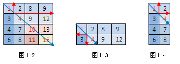 (2)以“红色元素”为分割点,对于行数大于等于列数的矩阵采用列二分搜索(如图1-2和图1-4所示矩阵)。如果key等于“红色元素”返回true;比“红色元素”大在列下侧搜索;比“红色元素”小,则key只可能在图中红色箭头围成的区域中,把这样的区域称为“最小区域”。发现“最小区域”后,直接进入最小区域搜索。