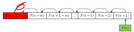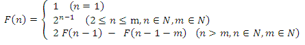 int jumpmm(int n,int m) {if(n <= m) {return 1<<(n-1);}//将f[0]...f[m]存放到队列中Deque<Integer> fq = new LinkedList<Integer>();fq.add(Integer.valueOf(1));for (int i = 0; i < m; i++) {fq.add(Integer.valueOf(1<<i));}//求fnint r = 0;for (int i = m+1; i < n;i++) {r = 2 * fq.peekLast() - fq.pollFirst();fq.add(Integer.valueOf(r));}r = 2 * fq.peekLast() - fq.pollFirst();return r;}