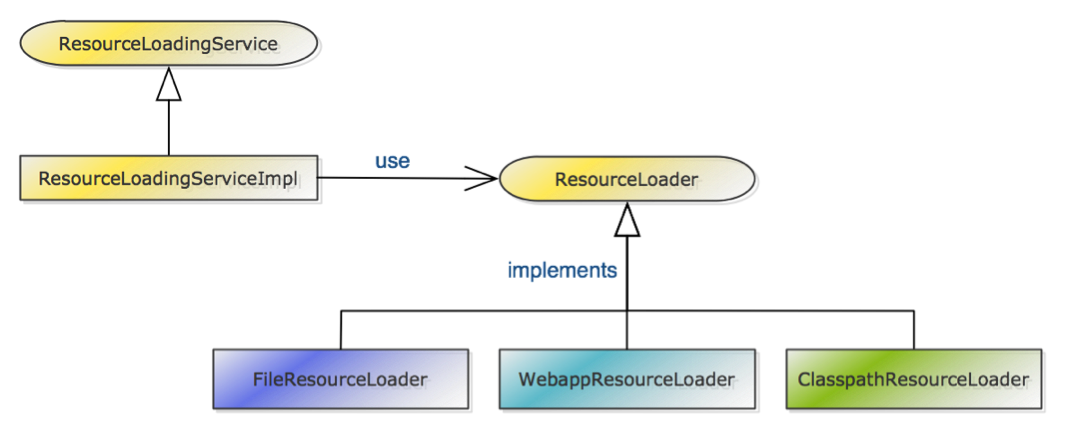 上面的配置如果有点Spring基础的都应该看的懂,典型的IOC。ResourceLoadingServiceImpl并不依赖FileResourceLoader和WebappResourceLoader,它只依赖它们的接口ResourceLoader。至于如何创建FileResourceLoader、WebappResourceLoader、需要提供哪些参数,这些都由spring来负责。