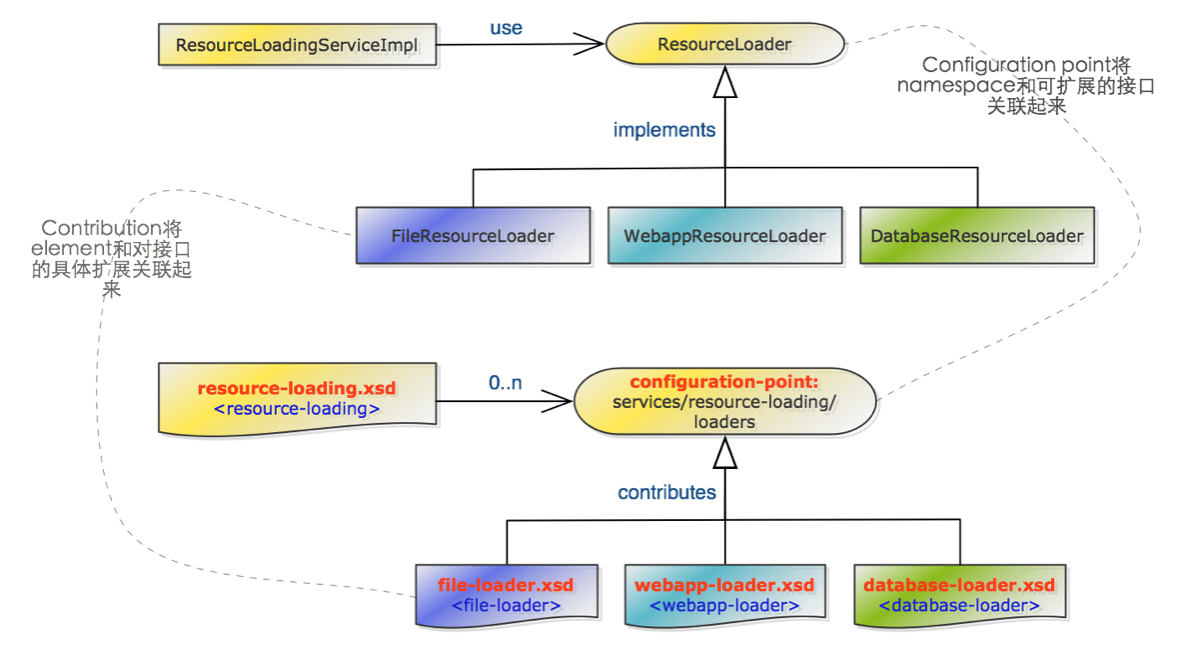 webx中有一个非常有用的ResourceLoadingService,它可以从各种输入源中(比如FileSystem、Classpath、Webapp等等)读取源文件的一种服务。下面就以这个服务为例来说明一下SpringExt是如何对Spring进行扩展使其符合OCP原则。