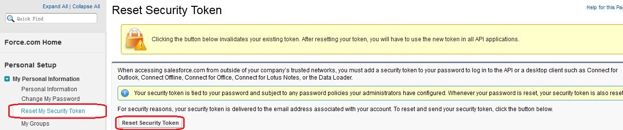 1、到SF申请一个开发者账户,任何设置自己的密码和安全码(访问必须要密码和Security Token),如果没有Security Token,这点击【Reset Security Token】按钮重置一下,在查看注册邮件就会收到了。具体看附件图: