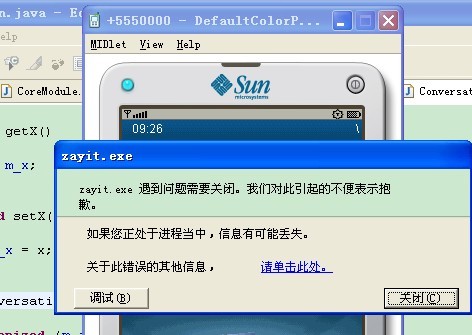 xx问题是这个程序不能在一些手机和wtk模拟器上工作。在手机上不能跟bug,因为根本打印不出来日志。程序运行在模拟器上时,会抛出一个系统错误(windows错误对话框那种弹出来),告知我zayit.exe发生错误,然后模拟器崩溃退出。错误画面: