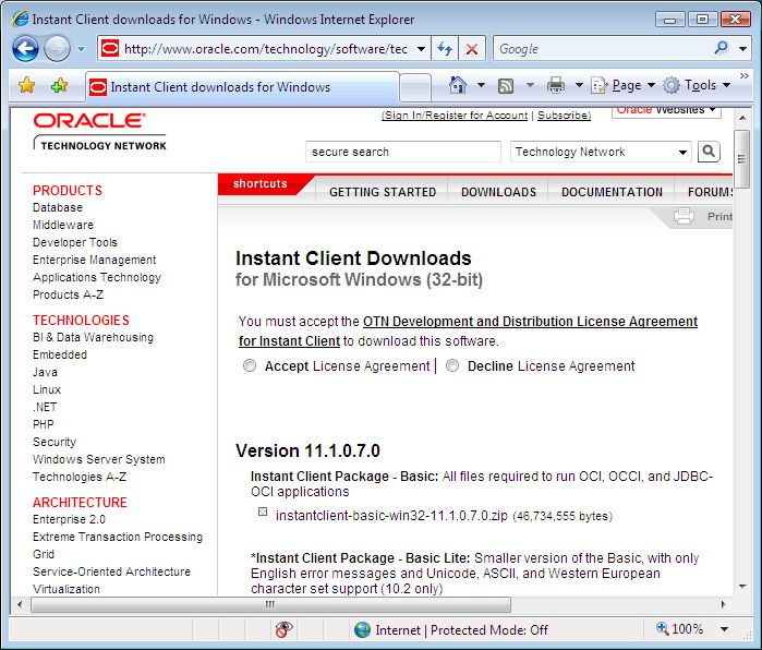 Download the appropriate Instant Client packages for your platform (must be 32-bit version, even you are using 64-bit Windows). All installations REQUIRE the Basic or Basic Lite package.