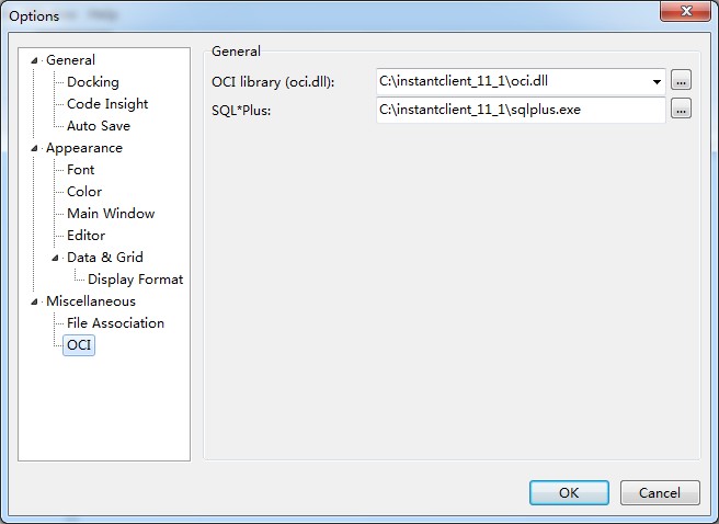 In Options -> OCI, choose the oci.dll in the directory you defined in Step 2 ("C:\instantclient_11_1\oci.dll").