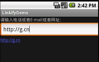package com.android.test;import android.app.Activity;import android.os.Bundle;import android.text.util.Linkify;import android.view.KeyEvent;import android.view.View;import android.widget.EditText;import android.widget.TextView;public class LinkifyDemo extends Activity { private EditText et; private TextView tv; public void onCreate(Bundle savedInstanceState) { super.onCreate(savedInstanceState); setContentView(R.layout.main); //获取资源 et = (EditText)findViewById(R.id.et1); tv = (TextView)findViewById(R.id.tv1); //增加事件响应 et.setOnKeyListener(new EditText.OnKeyListener(){ @Override public boolean onKey(View v, int keyCode, KeyEvent event) { tv.setText(et.getText()); //判断输入的类型是哪种,并与系统连接 Linkify.addLinks(tv, Linkify.WEB_URLS| Linkify.EMAIL_ADDRESSES|Linkify.PHONE_NUMBERS); return false; } }); }}