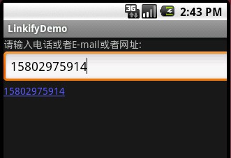 本节要讲的是,当我们在一个EditText输入电话或者网址还是Email的时候,让Android自动判断,当我们输入的是电话,我们点击输入内容将调用打电话程序,当我们输入是网址点击将打开浏览器程序.而Linkify很好的解决了这个问题.我们将分四步来完成这个Demo.