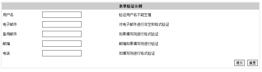 <!DOCTYPE html PUBLIC "-//W3C//DTD XHTML 1.0 Transitional//EN" "http://www.w3.org/TR/xhtml1/DTD/xhtml1-transitional.dtd"><html xmlns="http://www.w3.org/1999/xhtml"><head><meta http-equiv="Content-Type" content="text/html; charset=gb2312" /><title>表单验证实例</title><script language="javascript" src="checkform.js"></script><style>body { text-align:center; font-size:14px;}table {border:1px solid #CCCCCC;width:80%; text-align:left;}input { line-height:20px; border:1px solid #000000;}td { height:20px; padding:4px;}.right{ text-align:right;}.title{ font-size:14px; background-color:#CCCCCC; font-weight:bold; height:20px;}</style><script language="javascript">function checkform(frm){ var refalg=false; var f1,f2,f3,f4,f5; f1 = isEmpty(frm.UserName,1) f2 = isEmail(frm.Email,1,1) f3 = isEmail(frm.reEmail,0,1) f4 = isPostCode(frm.PostCode,1) f5 = isPhone(frm.Tell,1) refalg = f1 && f2 && f3 && f4 && f5 alert(refalg) return refalg;}</script></head><body><form id="form1" name="form1" method="post" onsubmit="return checkform(this)" action="http://www.91160.com/"> <table> <tr align="center"><td colspan="3" name="UserName" id="UserName" onfocus="isEmpty(this,0)" onblur="isEmpty(this,1)" /></td> <td id="UserNameInfo">验证用户名不能空值</td> </tr> <tr><td>电子邮件</td><td><input type="text" name="Email" id="Email" onfocus="isEmail(this,1,0)" onblur="isEmail(this,1,1)"/></td> <td id="EmailInfo">对电子邮件进行非空和格式验证</td> </tr> <tr><td>备用邮件</td><td><input type="text" name="reEmail" id="reEmail" onfocus="isEmail(this,0,0)" onblur="isEmail(this,0,1)"/></td> <td id="reEmailInfo">如果填写则进行格式验证</td> </tr> <tr><td>邮编</td><td><input type="text" name="PostCode" id="PostCode" onfocus="isPostCode(this,0)" onblur="isPostCode(this,1)" /></td> <td id="PostCodeInfo">邮编如果填写则进行验证</td> </tr> <tr><td>电话</td><td><input type="text" name="Tell" id="Tell" onfocus="isPhone(this,0)" onblur="isPhone(this,1)" /></td> <td id="TellInfo">如填写则进行格式验证</td> </tr> <tr> <td colspan="3" name="Submit" value="提交" /> <input type="reset" name="canter" value="重置" /></td></tr> </table></form></body></html>