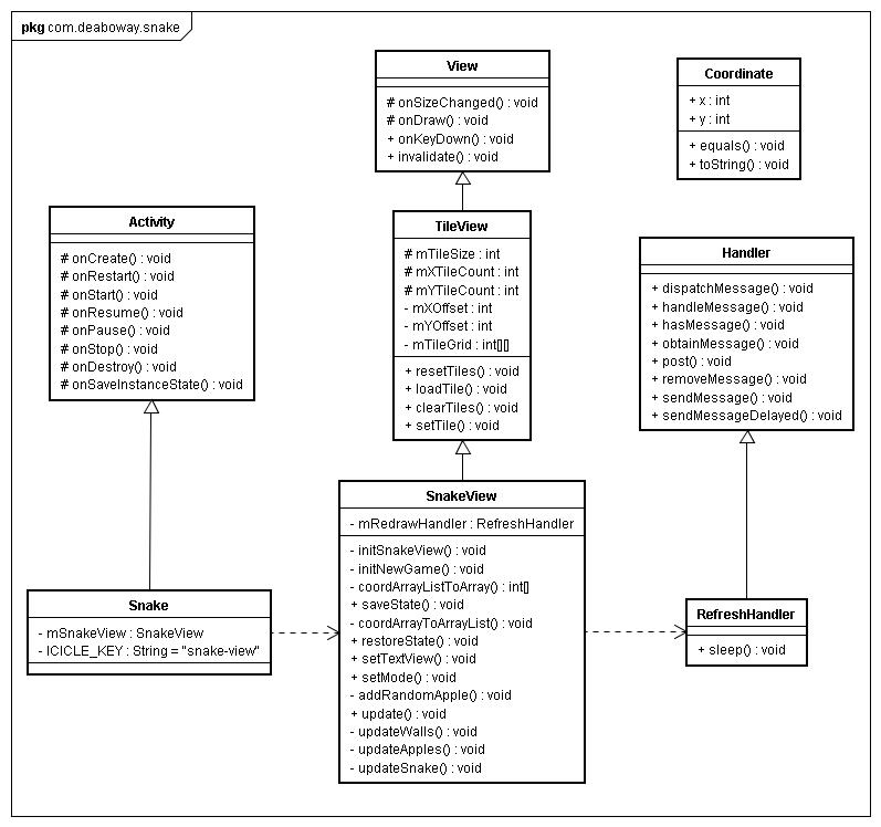 其实 Snake的工程蛮简单的,源文件就三个: Snake.java SnakeView.java TileView.java。 Snake类是这个游戏的入口点, TitleView类进行游戏的绘画, SnakeView类则是对游戏控制操作的处理。 Coordinate, RefreshHandler是 2个辅助类,也是 SnakeView类中的内部类。其中, Coordinate是一个点的坐标( x, y), RefreshHandler将 RefreshHandler对象绑定某个线程并给它发送消息。如下图: