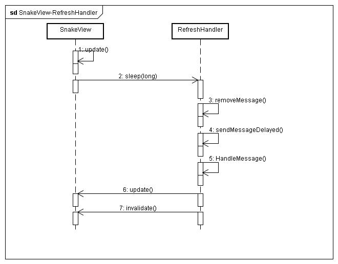 在 Snake这个游戏中,辅助类 RefreshHandler继承自 Handler,用来把 RefreshHandler与当前线程进行绑定,从而可以直接给线程发送消息并处理消息。注意一点: Handle对消息的处理都是异步。 RefreshHandler在 Handler的基础上增加 sleep()接口,用来每隔一个时间段后给当前线程发送一个消息。 handleMessage()方法在接受消息后,根据当前的游戏状态重绘界面,运行机制如下: