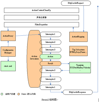 ? Struts2的核心体系结构如图5.1所示。用户在Struts2框架下只需编写自己的Action类来处理逻辑、编写JSP页面(或者其他方式)来展示用户界面和在struts.xml配置映射关系就可以完成基本的业务流程。