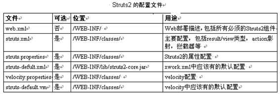 ? Struts2框架主要有两个核心配置文件:struts.properties和struts.xml。struts.xml与Struts1版本中的struts-config.xml非常类似,主要负责管理应用中的Action映射,以及该Action包含的Result定义等,而struts.properties文件则定义了Struts2框架的全局属性。所有的配置文件说明见表所示,图展示了几个配置文件所在位置和相互关系。