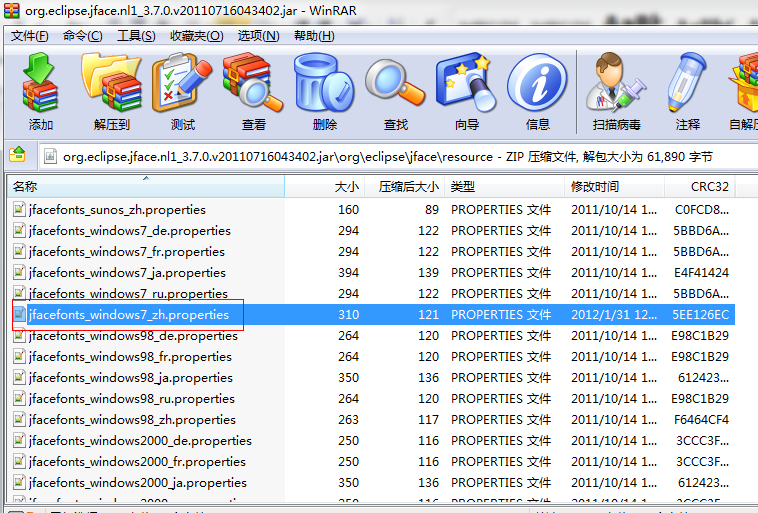 打开后,依次展开:/org/eclipse/jface/resource,这里,你将看到不同操作系统的字体设置,比如jfacefonts_windows7.properties,双击,随便用一个文本编译器打开,找到org.eclipse.jface.textfont.0的配置项,将其设置成Courier New-regular-10即可,修改完成后,保存,WinRAR自动更新jar包。