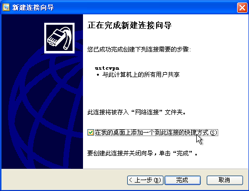建议勾选“在我的桌面上添加一个到此连接的快捷方式”,再点击“完成”按钮