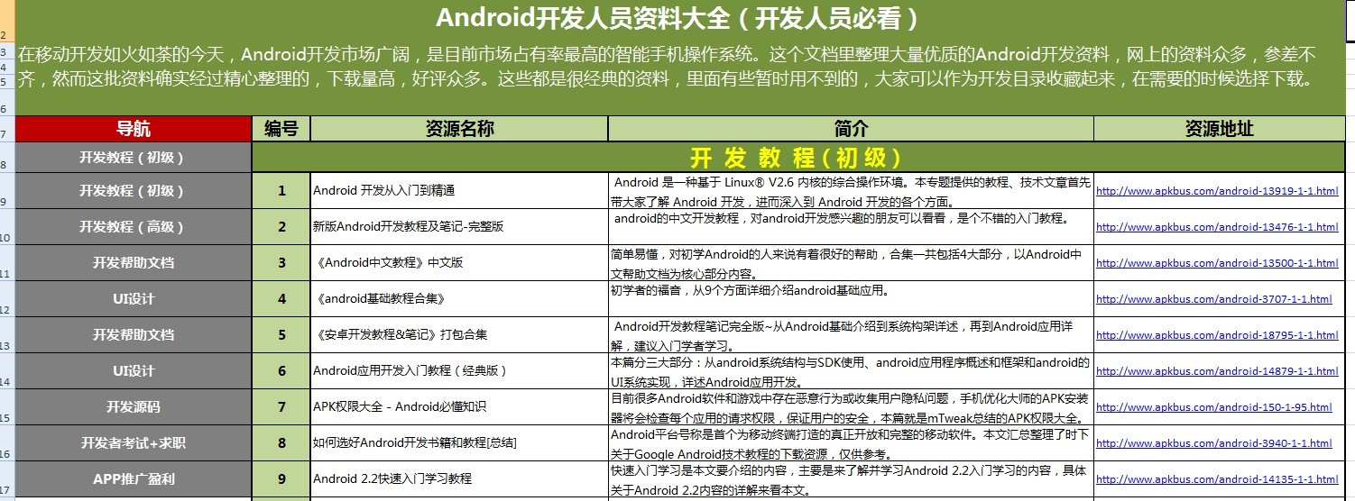 Android开发者资料大全(开发人员必看) 在移动开发如火如荼的今天,Android开发市场广阔,是目前市场占有率最高的智能手机操作系统。这个文档里整理大量优质的Android开发资料,网上的资料众多,参差不齐,然而这批资料确实经过精心整理的,下载量高,好评众多。这些都是很经典的资料,里面有些暂时用不到的,大家可以作为开发目录收藏起来,在需要的时候选择下载。 很实用的!!!