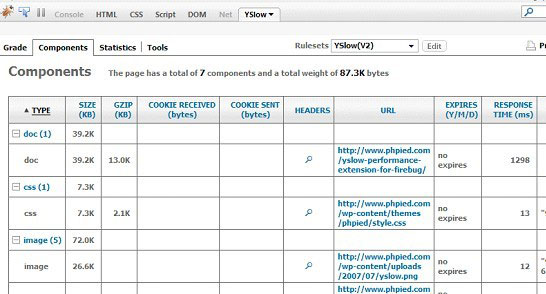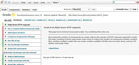YSlow根据一组高性能Web页面准则,通过检查页面上所有组件,包括由JavaScript创建的,来分析Web页面性能。YSlow是一个集成了Firebug Web开发工具的Firefox插件;它可提供提升页面性能的建议、总结组件性能、显示页面统计数据并提供用于性能分析的工具。
